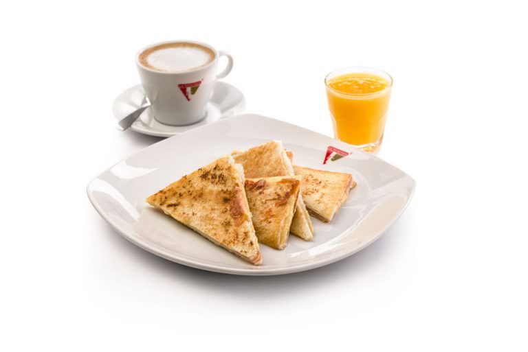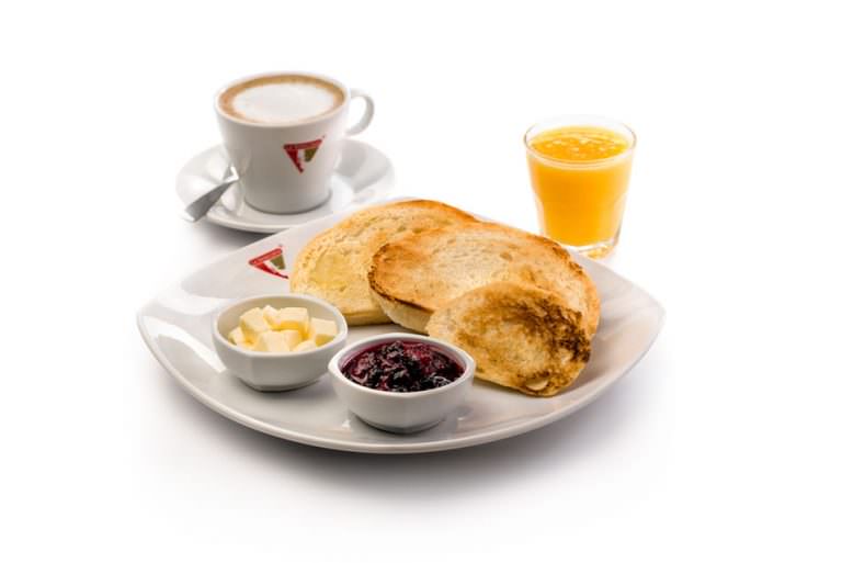 Café con leche, exprimido de naranja, tostadas de campo y manteca o queso crema y futos rojos o dulce de leche.