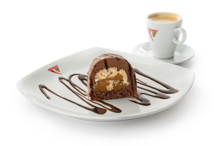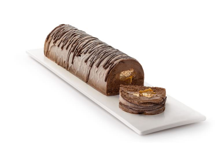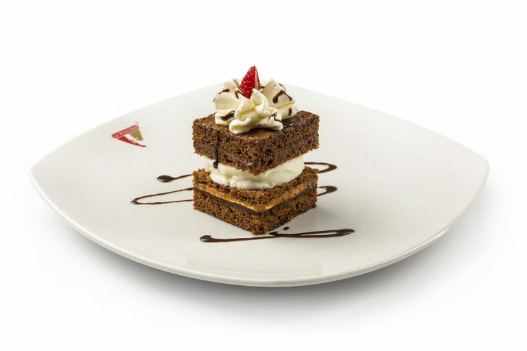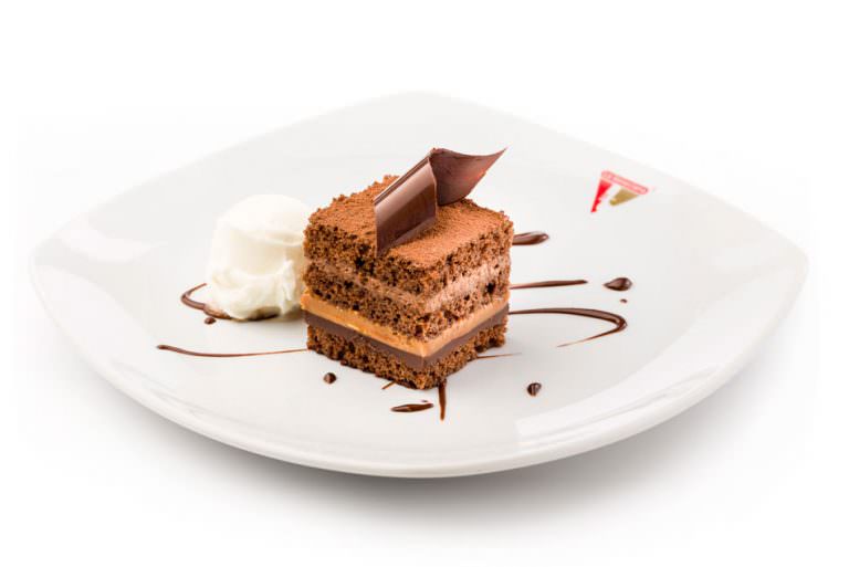 Bizcochuelo de chocolate, mouselina de chocolate y mousse de dulce de leche, con cubierta de chocolate.