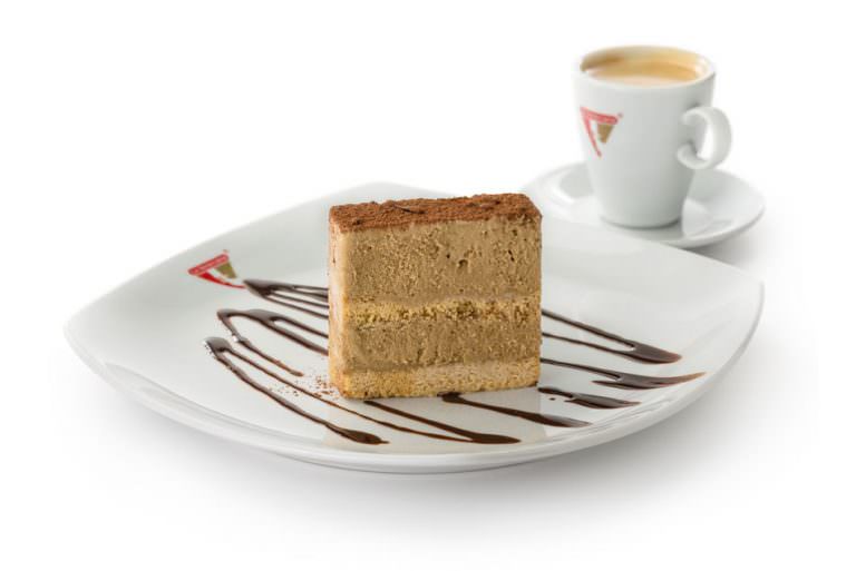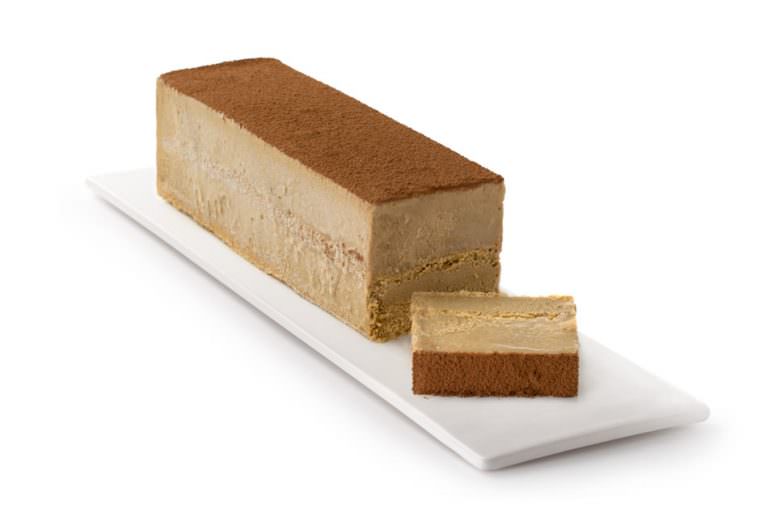 Base de bizcochuelo, helado de tiramisu y chcolate rayado.