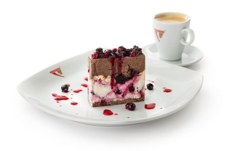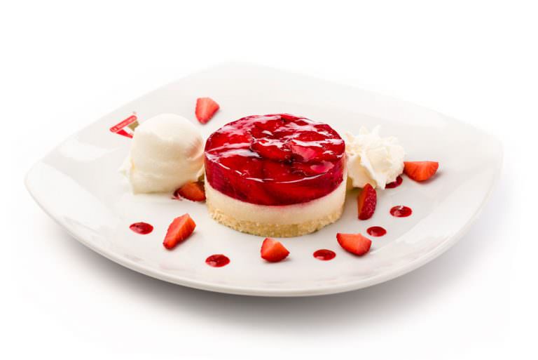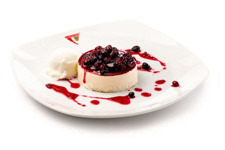 Base de bizcochuelo de vainilla, mousse de queso y gelee de frutos rojos.
