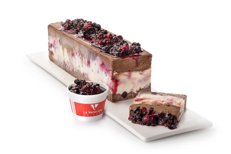 Biscochuelo de chocolate con helado de mousse de chocolate, helado de frutti di bosco, merengue y jalea de frutos rojos.