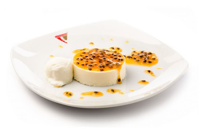 Base de bizcochuelo de vainilla, mousse de queso y gelee de maracuyá.