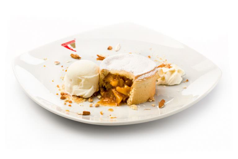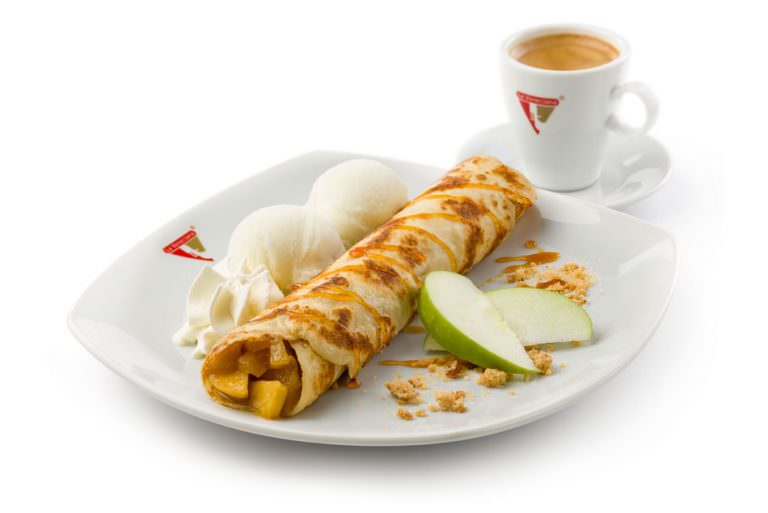 Panqueque de manzana verde caramelizada, helado de americana, crema batida y fino crocante de almendras y nueces.