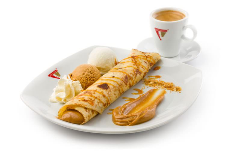 Panqueque de dulce de leche casero, helado de americana y dulce de leche, crema batida y fino crocante de almendras y nueces.
