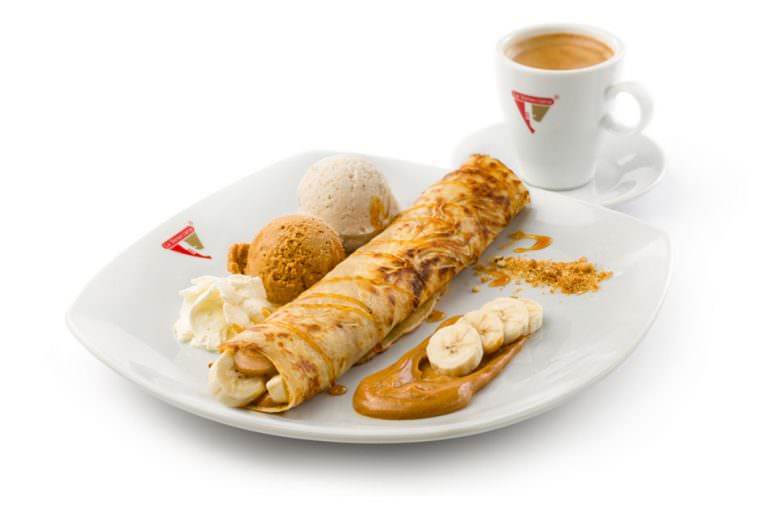 Panqueque de dulce de leche con banana, helado de banana y dulce de leche, crema batida y fino crocante de almendras y nueces.