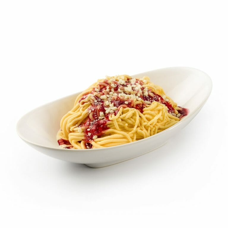 Helado: crema americana, jalea de frutos rojos, trozos de merengue y crema fresca batida.