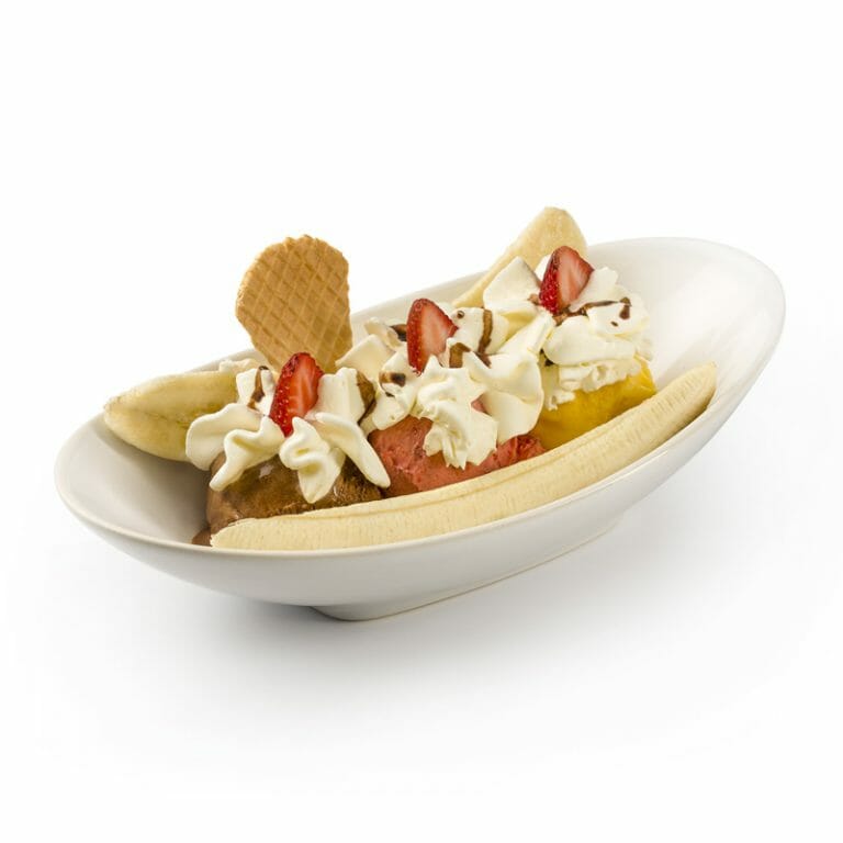 Helado: dulce de leche. Banana natural en rodajas, charlotte y crema fresca batida.