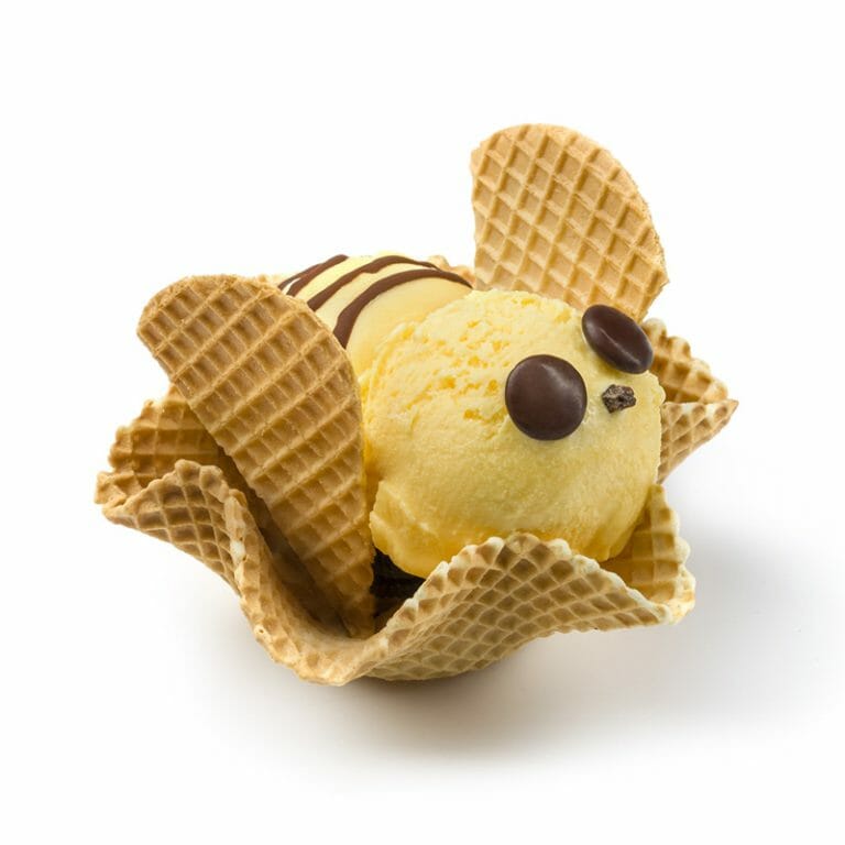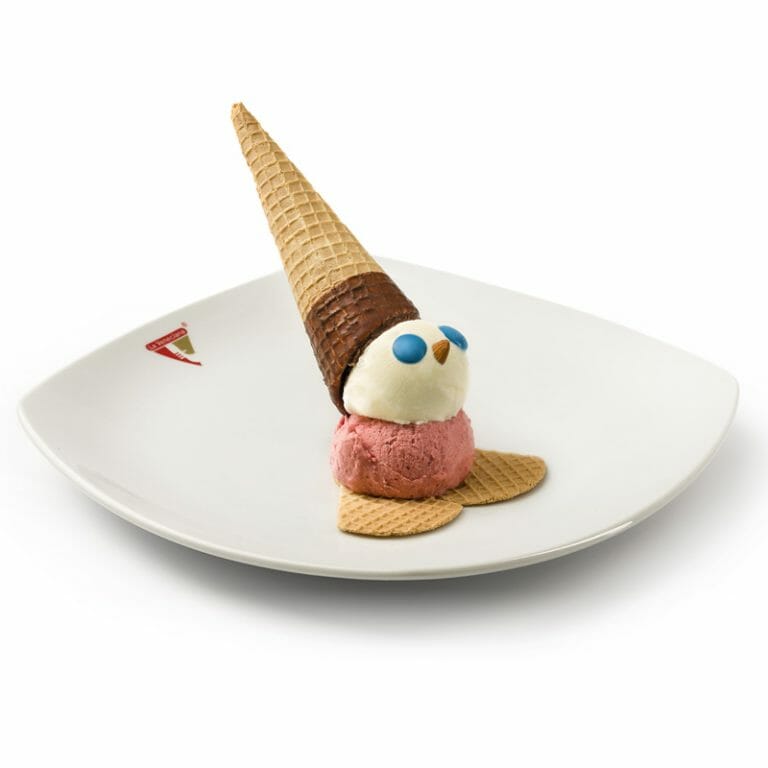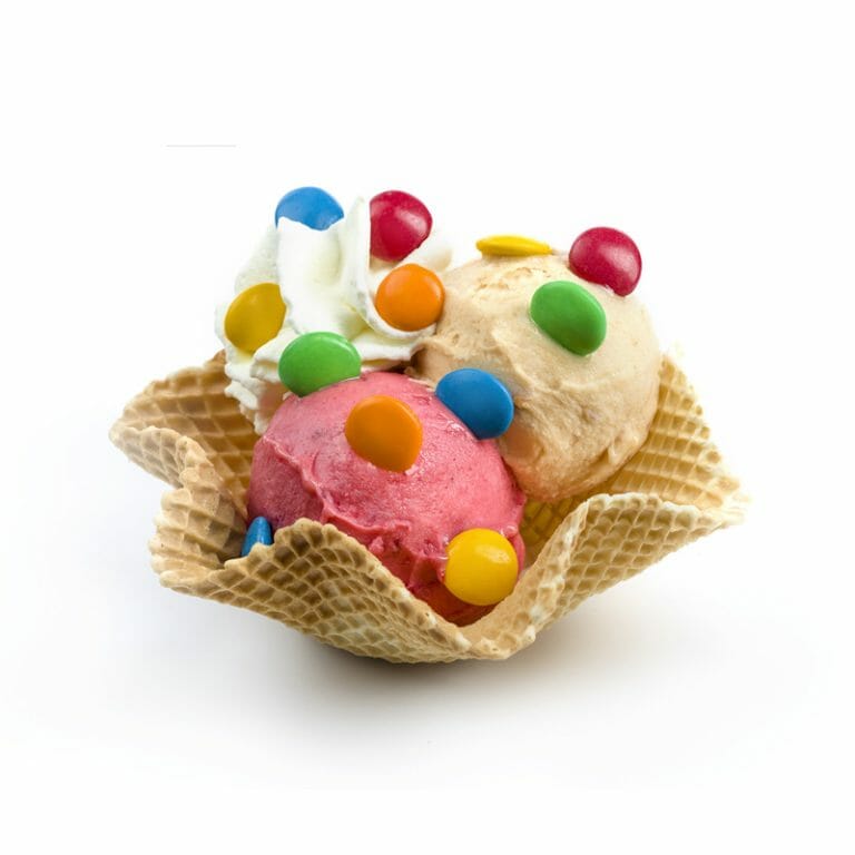 Helado artesanal servido en canastita, dos gustos a elección, confites de chocolate y crema fresca batida