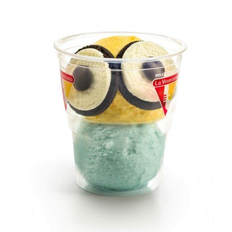 Helado artesanal de chocolate, frutilla y vainilla, banana natural, crema fresca batida y charlotte.